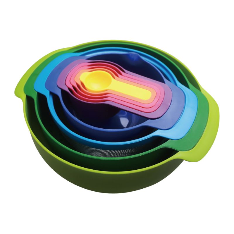 Dieses 10-teilige Plastikset ist ein unverzichtbarer Helfer in jeder Küche. Es enthält Schalen, Messbecher und Siebe, die die Zubereitung von Speisen und Backen erleichtern. Jede Schüssel hat eine leicht andere Farbe, und wenn Sie alle Teile zusammenbauen, entsteht eine beeindruckende und fröhliche Regenbogenfarbe. Die Schalen sind groß genug zum Vermengen und Rühren der Zutaten, die Messbecher helfen Ihnen, die benötigte Menge genau abzumeßen, und die Siebe dienen zum Trennen von Flüssigkeiten von festen Bestandteilen. Das Set besteht aus hochwertigem Kunststoff, der leicht zu reinigen und langlebig ist. Seien Sie kreativ und nutzen Sie dieses bunte 10-teilige Set, das Ihrem Küchenalltag fröhliche und praktische Erlebnisse bringt!
