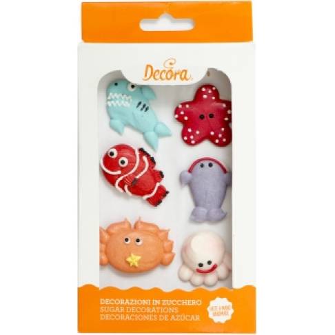 Vielfältige Tiere: Delfin, Fisch, Krabbe usw. Handgemachte Zuckerdekorationen. Bereit in einer praktischen, einsatzfertigen Blisterverpackung. Farben der natürlichen Extraktion. Schmücken Sie jeden Kuchen mit diesen Dekorationen – er wird originell aussehen und besonders Kinder begeistern. Zuckergussverzierungen kann auch ein Anfänger-Konditor anwenden. Sie sind auch eine tolle Lösung, um Kinder in die Arbeit einzubeziehen. Im Packung finden Sie 6 fröhliche Formen.