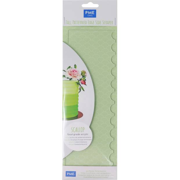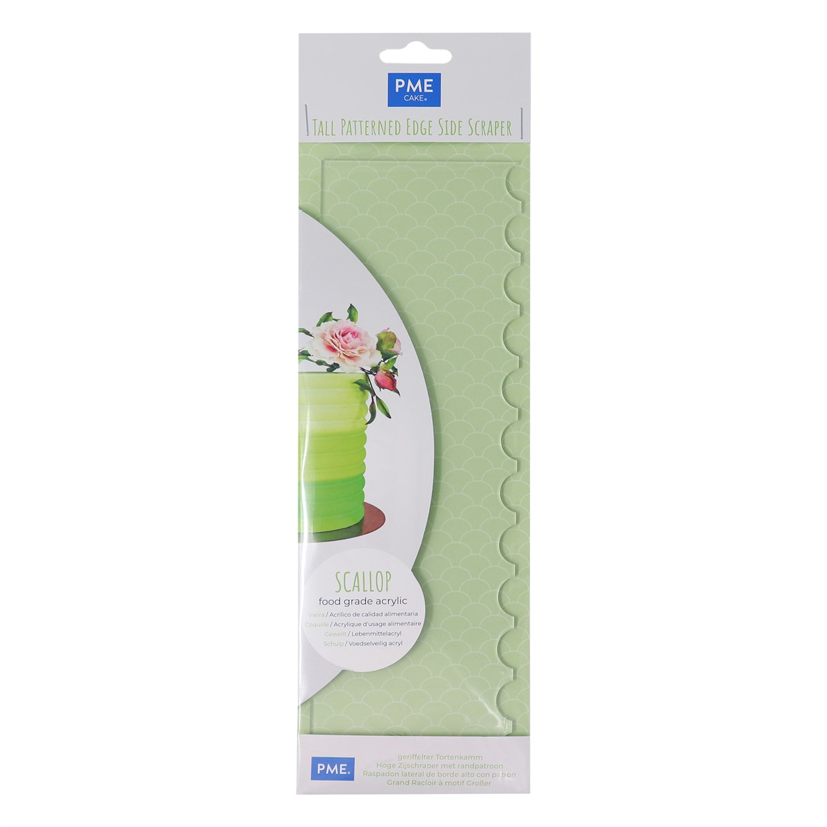 Die hohen gemusterten Seitenrandschaber von PME sind ein praktisches Werkzeug, mit dem Sie einen glatten oder gestreiften Butterkuchen herstellen können. Es können zwei Seiten des Schabers verwendet werden, eine Seite ist glatt und die andere Seite hat ein Wellenmuster. Er kann auch für Schokoladen- oder Royal Icing verwendet werden.