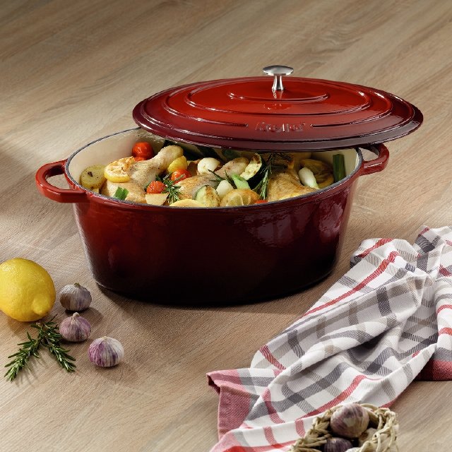 Ovaler Bräter Calido hat ein stilvolles Design, passt perfekt in Küchen im traditionellen Ländlich-Stil, aber auch in modern ausgestattete Haushalte. Mit der Ausstattung dieser Serie verwöhnen Sie das Auge, aber auch Ihre Geschmacksknospen dank der tollen Ergebnisse beim Backen und Braten von Gerichten. Der Bräter ist außen mit roter Emaillierung versehen und innen beigem Farbton. Die Gusseimenkasserne hält Wärme nicht nur gut, sondern bewahrt sie auch, sodass Ihre fertigen Speisen lange warm bleiben. Er hält zudem wirklich hohen Temperaturen im Ofen stand. Gusseisen-Geschirr hat eine wirklich lange Lebensdauer, es ist fast unsterblich. Geeignet für alle Herdarten, einschließlich Induktion. Im Lieferumfang ist ein Deckel mit Edelstahlgriff enthalten. Verwenden Sie ihn bis maximal 300 Grad Celsius.