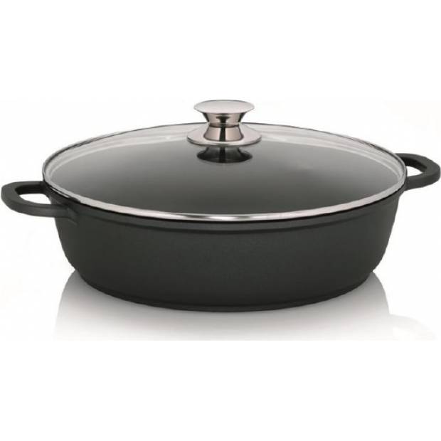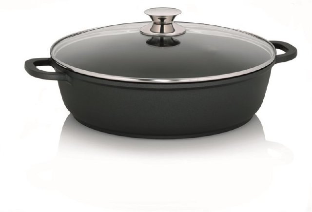 Backblech mit gehärtetem Glasdeckel aus hochdruckgegossenem Aluminium mit Wandstärke 5 mm. Backblech besitzt eine hochwertige antihaftbeschichtete GREBLON - C3. Die 3-schichtige, keramisch gefüllte Teflon-Schicht ist kratzfest.