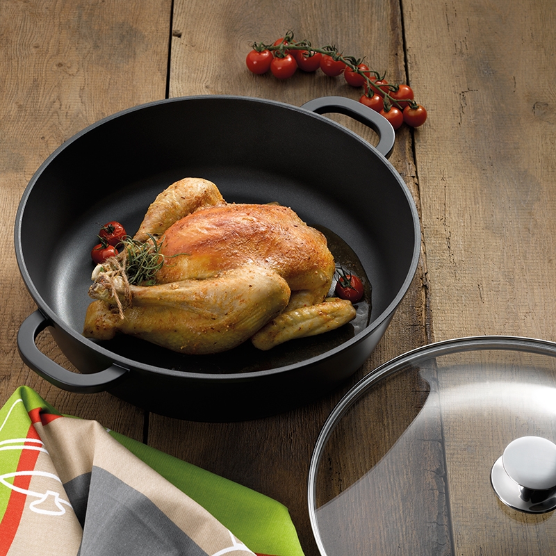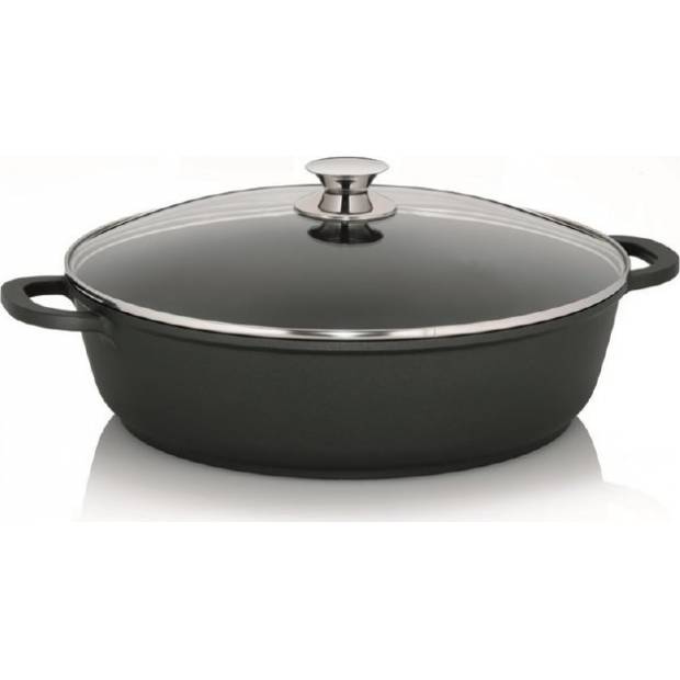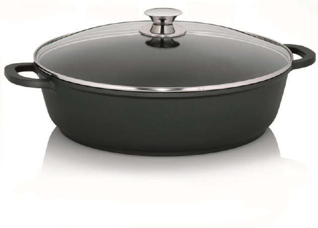Bräter mit glasdeckel aus druckgegossenem Aluminium mit Wandstärke 5 mm. Bräter hat eine hochwertig antihaftbeschichtete GREBLON - C3. Die dreischichtige, keramisch gefüllte Teflon-Schicht ist kratzfest. Verwendung: Gas, Glaskeramik, Induktion, e