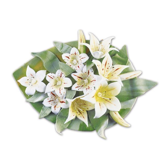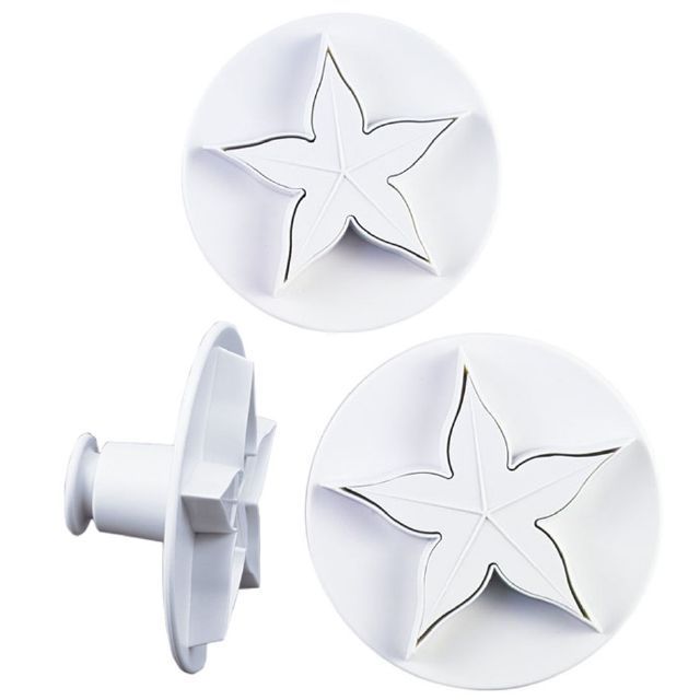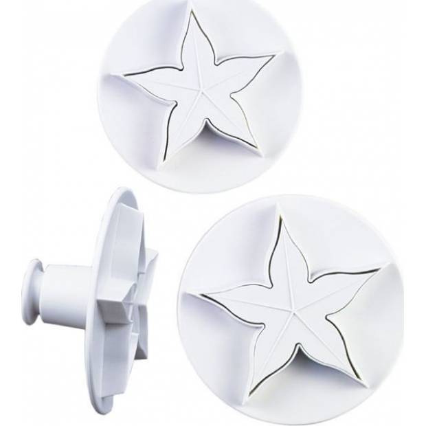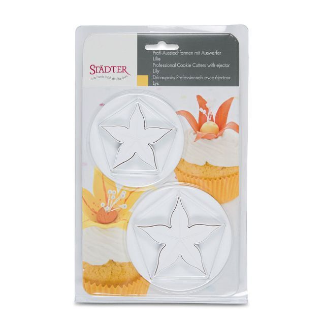 Professionelles Ausstechwerkzeug in Lilienform mit Kolben. Der Ausstecher besteht aus weißem Kunststoff und hat eine Größe von 10 cm. Er lässt sich sehr leicht verwenden. Legen Sie ihn einfach auf Fondant oder Teig, drücken Sie den Kolben und Sie können sofort Ihre Kuchen oder Gebäck verzieren.