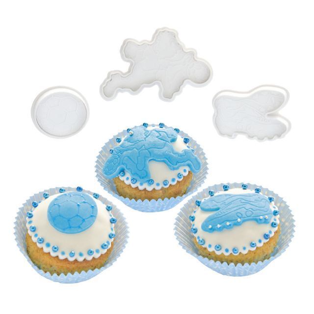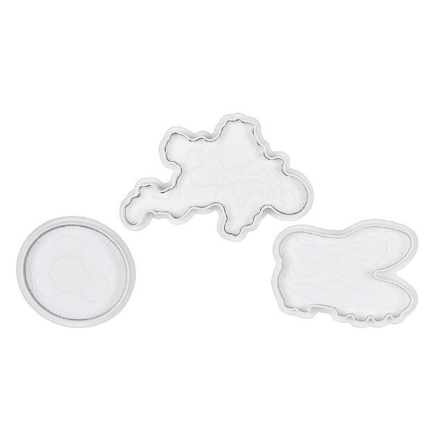 Set aus 3 Kunststoff-Pistolen-Ausstechformen in Form eines Balls, eines Fußballspielers und eines Schuhs. Das Dekorieren von Torten oder Gebäcken ist einfach. Legen Sie die Ausstechform auf den ausgerollten Teig, schneiden Sie die Form aus, ohne den Pistendruck zu verwenden – nur durch Drücken des Randes der Ausstechform. Die ausgestochene Form bleibt im Teig und wird mit der Pistze herausgedrückt. Mit der Ausstechform können Sie die Torte direkt verzieren – legen Sie die ausgestochene Form auf die Oberfläche der Torte und drücken Sie einfach die Pistze.