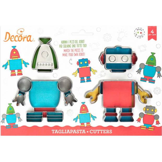 Satz mit 4 Plastikstempeln. Dekorieren Sie in Form eines Roboters und kreieren Sie köstliche Süßigkeiten oder Zuckerpastenformen für Kuchen und Desserts. Niedliche Ausstechformen für Süßigkeiten aus lebensmittelechtem, spülmaschinenfestem und wiederverwendbarem Kunststoff, ideal für Süßigkeiten und selbstgemachte Kuchendekorationen. Haben Sie Spaß mit diesen Ausstechern und kreieren Sie Ihre eigenen Kekse, indem Sie austauschbare Roboterteile kombinieren, um Ihren eigenen Roboter zu kreieren! Hergestellt in Italien. Ausstechformen, die nicht nur zum Ausstechen von Mürbeteig, sondern auch zum Modellieren von Teig, Zuckerpaste, Schokolade und Salzteig verwendet werden können. Hergestellt aus hochwertigen, professionellen Materialien, die für den Kontakt mit Lebensmitteln zertifiziert sind. Lebensmittelschneider aus silbergrauem Kunststoff. Roboter 1: Kopf 4,5 x 5,9 x H 2,2 cm - Körper 11,3 x 7,2 x H 2,2 cm. Roboter 2: Kopf 6,6 x 4,5 x H 2,2 cm - Körper 11,7 x 7,1 x H 2,2 cm.