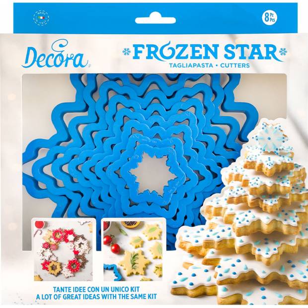Set aus 8 Kunststoff-Ausstechformen, ideal für die Herstellung von Schneeeinlagen-Dekorationen am Weihnachtsbaum oder beim Backen. Durch das übereinanderlegen der Formen von der größten zur kleinsten entsteht ein fantastischer Baum, der verziert werden kann. Schöne Plastikformen für Lebensmittel, spülmaschinenfest und wiederverwendbar. Viel Spaß mit diesen Ausstechern und erstellen Sie Ihre eigenen personalisierten Kekse und verzieren Sie sie nach Belieben mit Zuckerguss, Glasur, Streuseln und Lebensmittelfarben. Hergestellt aus hochwertigen professionellen Materialien, zertifiziert für den Kontakt mit Lebensmitteln. Abmessungen: von ca. 4,5 bis ca. 26,5 cm, Dicke 2,2 cm.