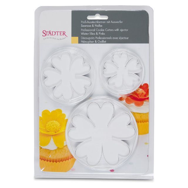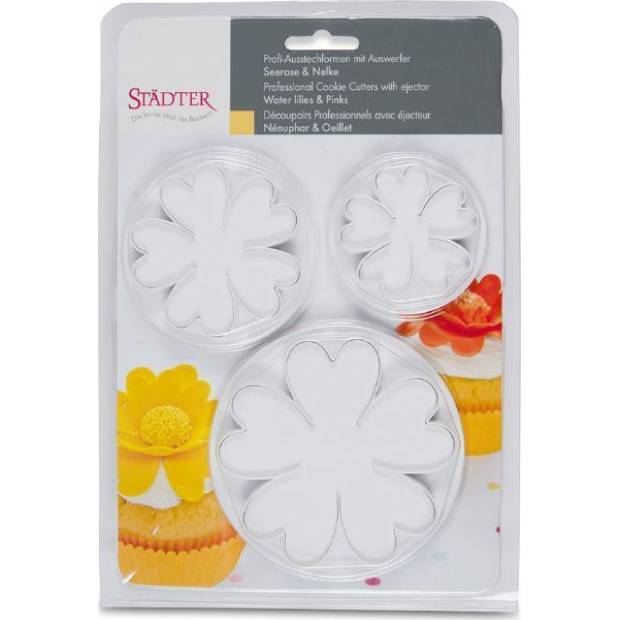 Set aus 3 Kunststoff-Stempelkuchen-Ausstechern in der Form von Lotus/Karafiolilie. Das Dekorieren von Torten oder Gebäck ist einfach. Den Ausstecher auf den ausgerollten Teig legen, die Blüte ausgestochen, ohne den Stempel zu drücken – nur den Rand des Ausstechers anlegen. Die ausgestochene Form bleibt drin und mit dem Stempel wird sie herausgepresst. Mit dem Ausstecher können Sie die Torte direkt dekorieren – den ausgestochenen Formaufbau auf die Oberfläche der Torte legen und einfach den Stempel drücken.