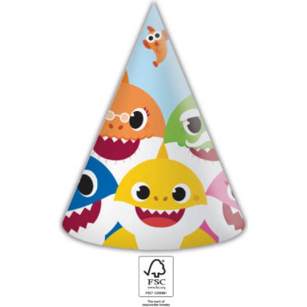 Papiermützen mit Baby-Shark-Motiv. In der Packung 6 Stück.