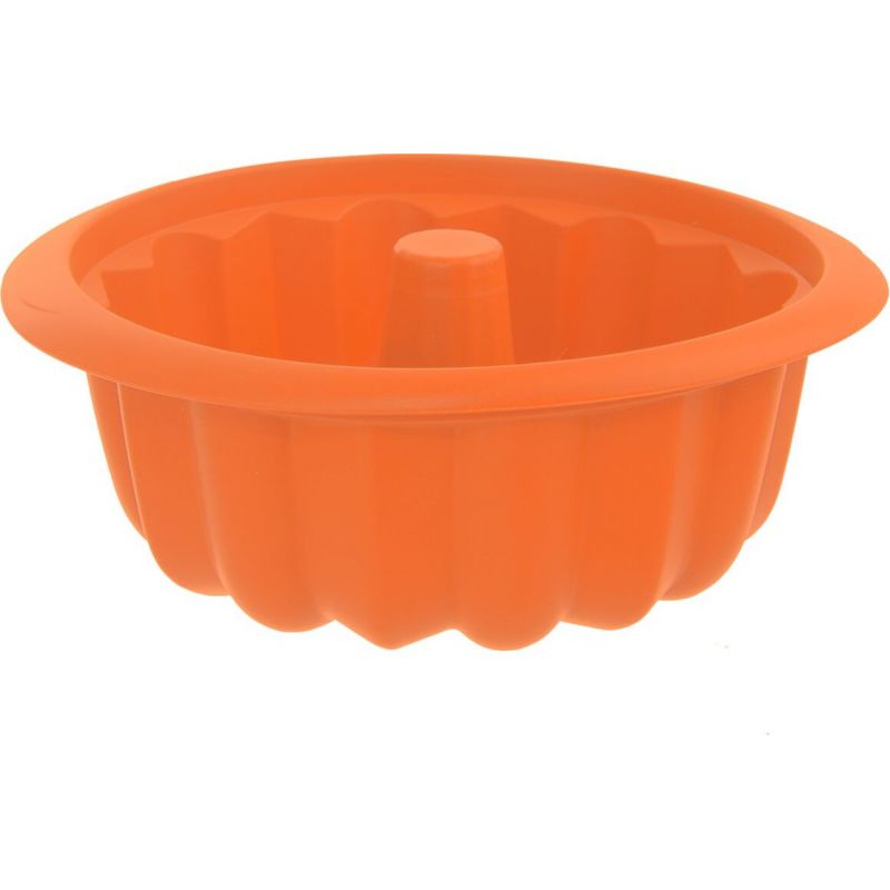 Eine antihaftbeschichtete Silikonform in Orange ist geeignet für luftig gemusterte Biskuit-Gugelhupf, lockere Tassenrezepte mit Nüssen, Schokolade und kandierten Früchten sowie unkonventionelle Rezepte mit Lavendel- oder Kaffeearoma. Die Rippenstruktur ermöglicht gleichmäßiges Schneiden.