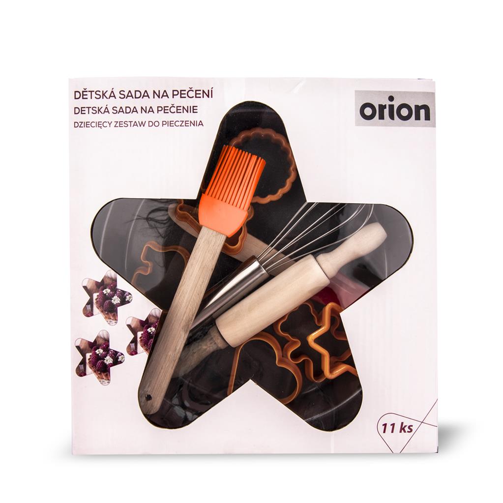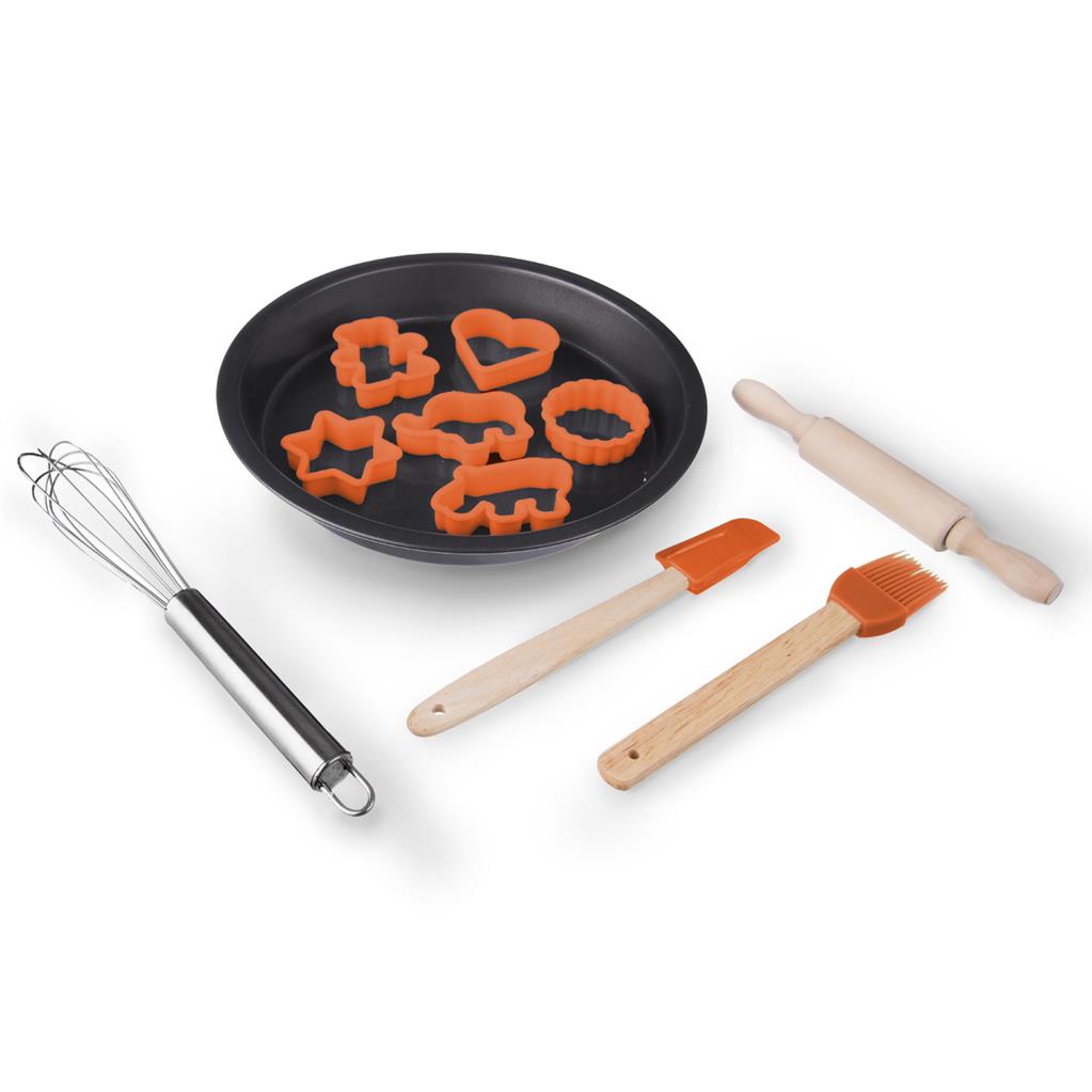 Kinder-Backset besteht aus 11 Teilen: eine runde Backform mit antihaftbeschichtetem Boden Ø 22,5 cm, 6 Kunststoffformen in verschiedenen Formen, Backpinsel und Spachtel – Holz, Silikon, Ø 19 cm, eine Edelstahl-Rührbesen Ø 22 cm und eine hölzerne Nudelrolle Ø 17,5 cm. Mit diesem Set haben kleine Köche und Konditoren auf jeden Fall Spaß. Damit können sie Teig verarbeiten, aber auch Plastilin, Modurit, Fimo oder andere Materialien. Alles ist gesundheitlich unbedenklich, vollständig spülmaschinengeeignet.