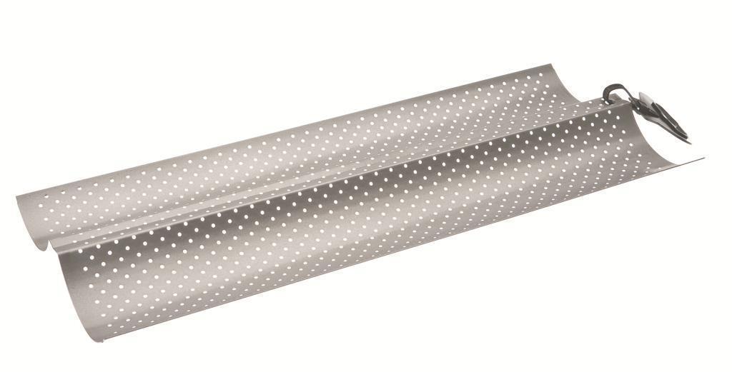 Spezielles Bagetengeschirr mit Abmessungen von 38 x 16,5 Zentimetern zum Backen von zwei Bageten. Der Metallgrund ist mit einer Antihaftbeschichtung versehen und durch eine Perforation so bearbeitet, dass die Kruste goldbraun und knusprig wird. Bagetengschirr/Backblech für Bageten kann im Heißluft-, Gas- oder Elektroofen verwendet werden und hält Temperaturen bis 230°C. Wir empfehlen manuelles Reinigen und nicht in der Spülmaschine. Höhe 2,5 cm. Wir empfehlen eine Form für 4 Bageten zu verwenden!