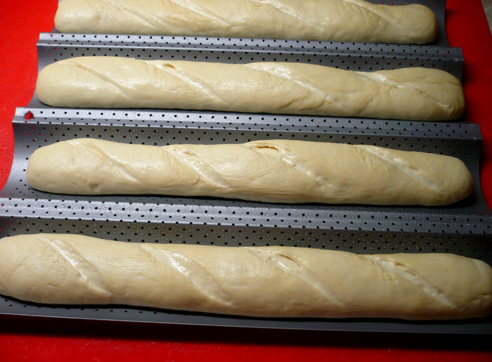 Ich kann das Backblech für Bageten nur empfehlen. Es ist sehr angenehm damit zu arbeiten, der Hauptvorteil ist, dass die Bageten ihre Form behalten und der Teig auch etwas lockerer sein kann. Die Oberfläche ist antihaft, man muss sie nicht einölen. Ein weiterer unbestreitbarer Vorteil ist, dass das Blech perforiert ist und die Bageten an der ganzen Oberfläche gut und gleichmäßig durchgebacken werden und schön knusprig sind. Auf dem Blech backe ich verschiedene Bagetensorten, je nachdem, wofür sie serviert werden. Bisher nie enttäuscht. Die fettarmen sind zum Verzehr am Backtag bestimmt, und diejenigen, in die Fett oder Grieben eingeknettt wird, bleiben auch am zweiten Tag weich.