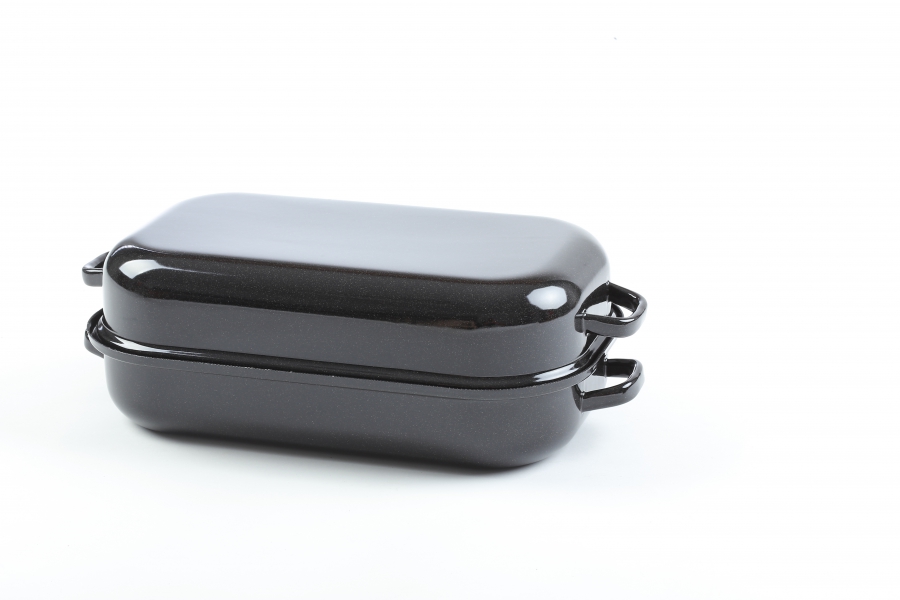 Beidseitig emaillierter Doppelfalttopf aus Stahlblech geeignet für Gas-, Elektro- und Heißluftofen. Traditioneller emaillierter Bräter wird wegen seiner hochwertigen Verarbeitung geschätzt. Das Blech ist 1 mm dick, dadurch formstabil und langlebig. Der Bräter in Hochglanz ist außen mit schwarzer Emaille versehen. Verleiht diesem Produkt eine hohe Robustheit, geringe Pflegebedürftigkeit und eleganten Look. Wir empfehlen ihn per Hand zu reinigen. Innenmaß 40 cm, äußere Maße 48 x 26 cm.