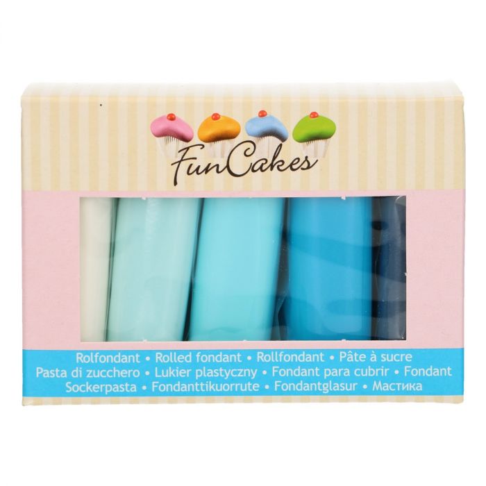 Set von Abdeckmassen mit neuem und verbessertem Rezept. Das neue Fondant ist jetzt fester, elastischer und glatter als zuvor. Aufgrund seiner außergewöhnlichen Festigkeit lässt es sich unter allen Bedingungen gut verarbeiten. Auch geeignet für wärmere und feuchtere Klimabedingungen. Beim Formen reißt es nicht. Sie können verschiedenste Figuren und Formen erstellen, verschiedene Blüten und Muster modellieren. Es lässt sich wirklich dünn ausrollen. Damit lassen sich jede Torte problemlos überziehen oder Formen für die Dekoration ausschneiden. Diese Abdeckmassen eignen sich sowohl für Anfänger als auch für Profis. Das Set enthält verschiedene Blautöne und Weiß und hat Vanillegeschmack. Verpackung 5 x 100 g.