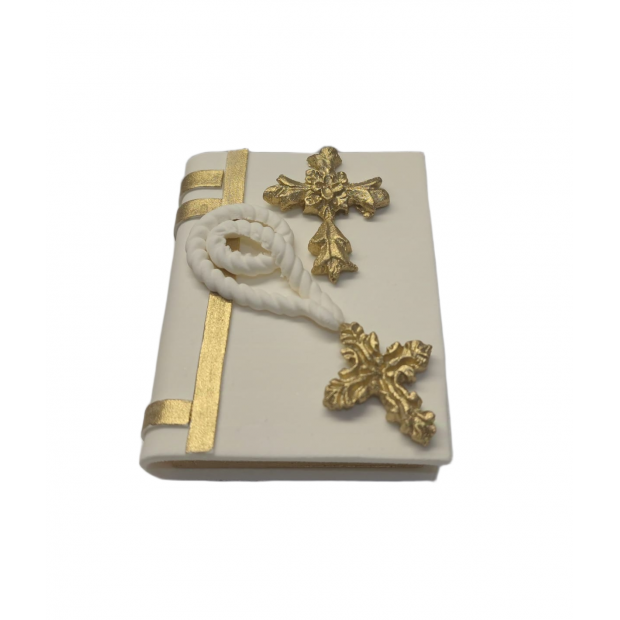 Diese wunderschöne Figur in Bibelform ist vollständig handgefertigt, damit sie auf der Torte wirklich außergewöhnlich wirkt. Jedes Detail – vom feinen Andeuten der Seiten bis zum präzise gearbeiteten Kreuz auf dem Einband – ist mit großer Sorgfalt verarbeitet, sodass die Dekoration wie ein kleines Buch aussieht, das Ruhe, Glauben und familiäre Feier symbolisiert. Der goldene Kreuz verleiht der ganzen Figur ein festliches und elegantes Erscheinungsbild, das perfekt zu Taufkuchen sowie Kuchen für religiöse Anlässe passt.