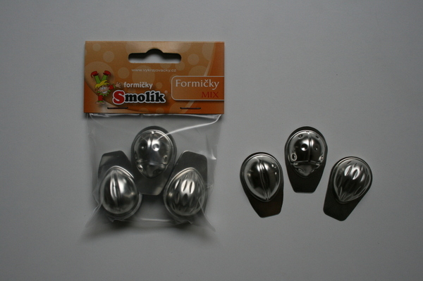 Formen haben die Abmessungen 4,2 x 5 cm. Sie sind aus gesundheitlich unbedenklichem verzinntem Blech hergestellt, aus dem sich das Gebäck immer gut lösen lässt. Das Set enthält fünfzehn Formen – je drei Formen zu je fünf Stück.