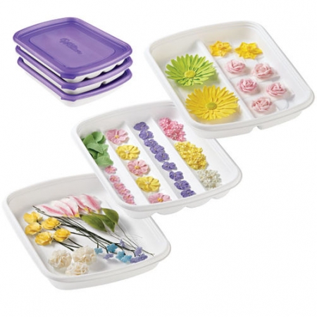 Diese drei einzigartigen Blumen-Stacker von Wilton sind speziell konzipiert für sicheres Formen, Aufbewahren und auch den Transport von royal Icing, Gummi- icing und Fondant- oder Marzipan-Dekorationen. Die Schalen haben drei Formen: für konkave und konvexe Blumenformen, für flache und große Blumen und für Blumen und Blätter auf Stielen. Die Deckel sitzen dicht, schützen vor Feuchtigkeit und Staub. Die Aufbewahrungsbehälter greifen ineinander, Sie können sie übereinander stapeln und so Platz sparen. Vor dem ersten Gebrauch und nach jedem Gebrauch die Behälter gründlich waschen. Breite 33 cm, Tiefe 23 cm.