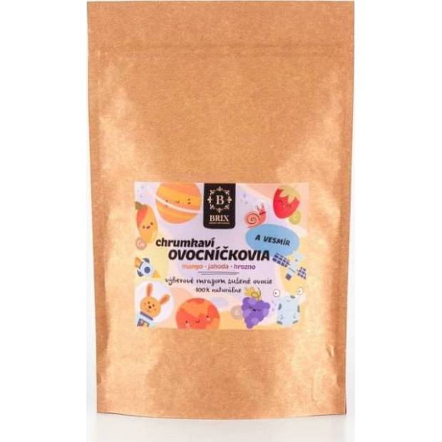 Gefriergetrocknete Früchte sind 100% reine Früchte, denen das Wasser entzogen wurde. Es ist knusprig getrocknet, behält seine Farbe, seinen Geschmack und bis zu 98 % seines Nährwerts und ist damit fast identisch mit der ursprünglichen Frucht. Sie ist frei von Konservierungsstoffen. Sie können rehydriert oder direkt verzehrt werden. Ideal für Müsli, Joghurt, Sorbets, Smoothies, kulinarische Spezialitäten und zum Backen. Je 100 g gefriergetrocknete Früchte werden aus 800 g bis 1 kg frischen Früchten hergestellt. Zutaten: gefriergetrocknete Weintrauben 38%, Mangos 37%, Erdbeeren 25%. Nährwerte pro 100 g: Energie 1227 kJ/293 kcal, Fett 1,3 g (davon gesättigt 0,1 g), Kohlenhydrate 68,9 g (davon Zucker 55,6 g), Ballaststoffe 6,5 g, Eiweiß 4,1 g, Salz <0,01 g