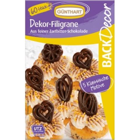 Ozdobné čokoládové filigránky v podobě srdíček, které doplní vaše dortové a cupcakes dekorace. Ozdobte své dorty v profesionálním stylu s okouzlujícími čokoládovými čtyřlístky. V balení celkem 60 jedlých srdíček a 5 různých motivů.