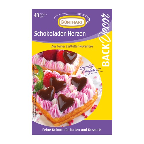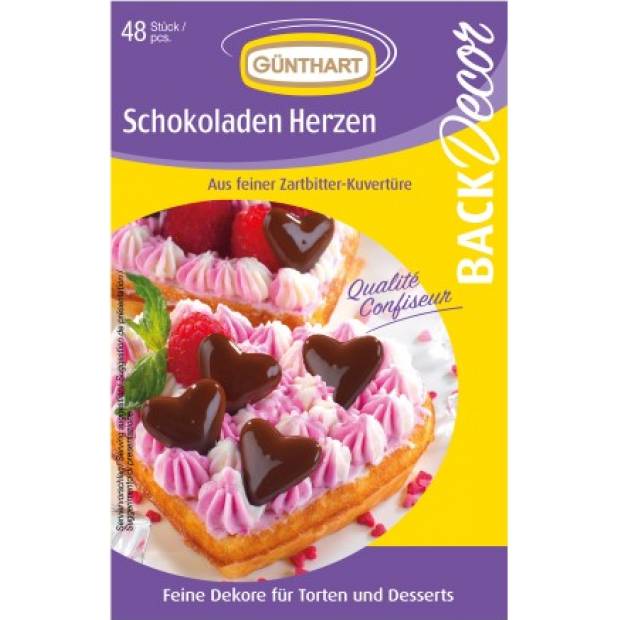 Schokoladendekoration in Form von bunten Herzen. Sie können sie auf Torten, Muffins, Cupcakes oder Tassen verwenden. 48 Stück in der Packung.