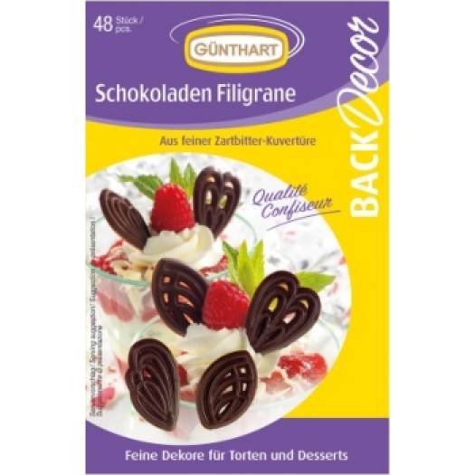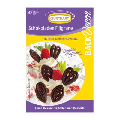 Die Packung enthält 48 Schokoladenfiligrane. Schokoladenfiligran kann zum Dekorieren von Kuchen, Cupcakes, Brötchen und anderen beliebten Desserts für verschiedene Anlässe verwendet werden. Kakao 57% min.