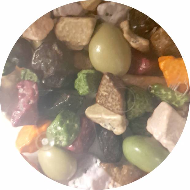 Složení: čokoládová náplň 77% (cukr, rostlinný olej palmový, kakaový prášek, maltodextrin, sójový lecitin, čokoládová příchuť), cukr 21%, leštící činidlo E414, E903, barviva (E170, E153, E160c, E140, E163, E120, E100), regulátor kyslosti E330