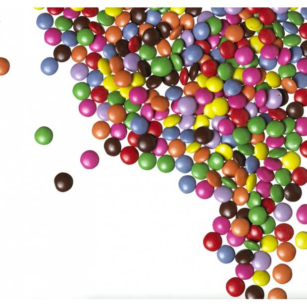 Složení: cukr, kakaová hmota, kakaové máslo, sušené plnotučné mléko, škrob, emulgátor (E322), leštící látky (E414, E903, E901, E904), koncentráty šťáv (hrozen, ředkev, černý rybíz, citron, červená řepa), extrakt ze světlice barvířské, ječný sladový extrakt, koncentrát z řas Nutriční hodnoty ve 100 g: energie 1982 kJ/474 kcal, tuky 19 g (z toho nasycené 12 g), sacharidy 70 g (z toho cukry 67 g), bílkoviny 3,7 g, sůl 0,1 g