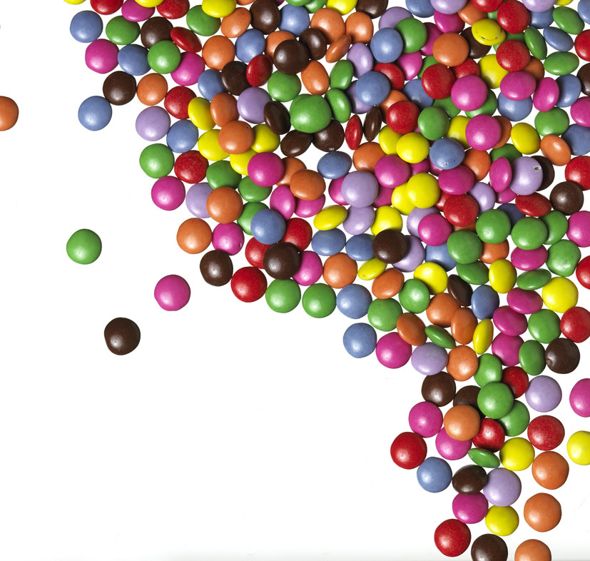 Složení: cukr, kakaová hmota, kakaové máslo, sušené plnotučné mléko, škrob, emulgátor (E322), leštící látky (E414, E903, E901, E904), koncentráty šťáv (hrozen, ředkev, černý rybíz, citron, červená řepa), extrakt ze světlice barvířské, ječný sladový extr
