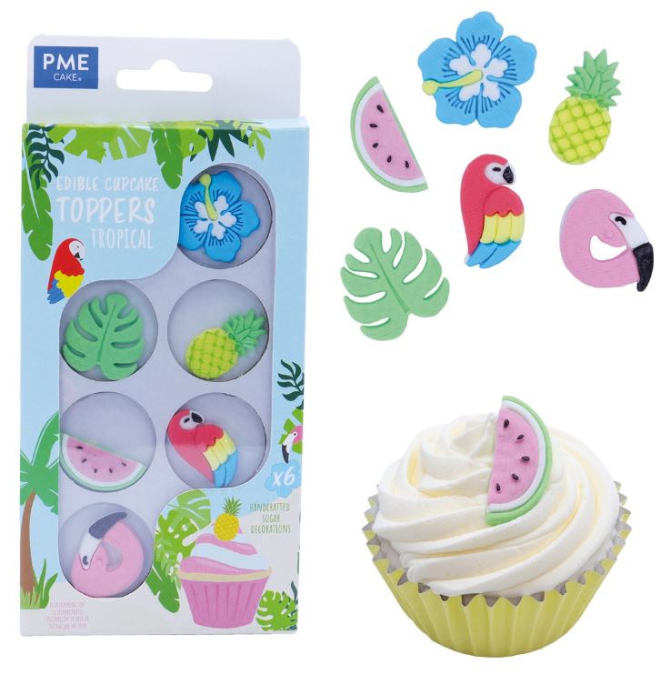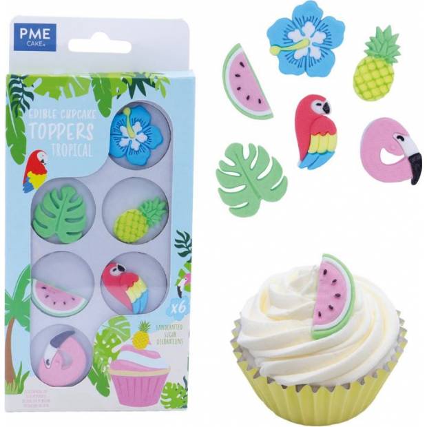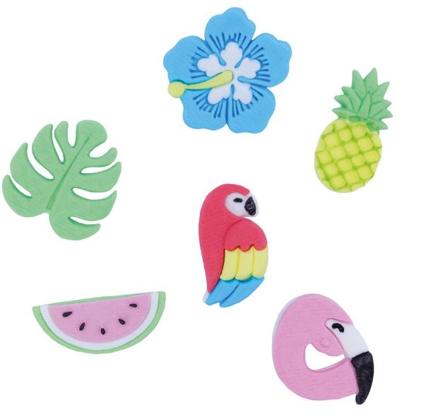 Vollständig essbare, handgefertigte Dekoration aus Gummipaste. Das Set enthält: Hawaii-Blume, tropisches Blatt, Ananas, Wassermelone, Papagei und Flamingo. Diese Ornamente sind vorgeschnitten, so dass kein Schneiden erforderlich ist. Größe: ca. 5 cm im Durchmesser.
