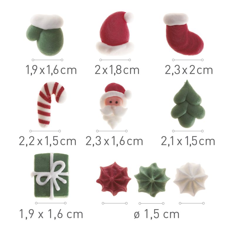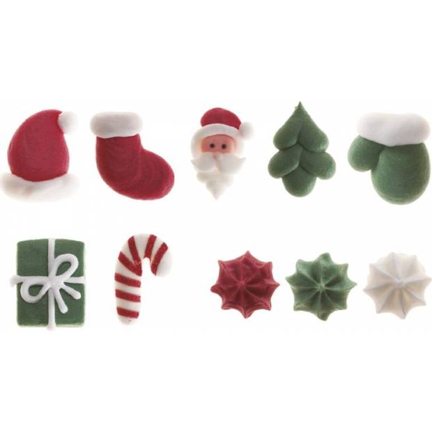 Balení jedlých cukrových ozdob ve tvaru různých vánočních postaviček. Tvary jsou vánoční dárek, Santa Claus, vánoční stromeček a cukrová hůl. Skvělé pro zdobení vánočních cupcaků nebo dortů! Balení obsahuje 24 dekorací.