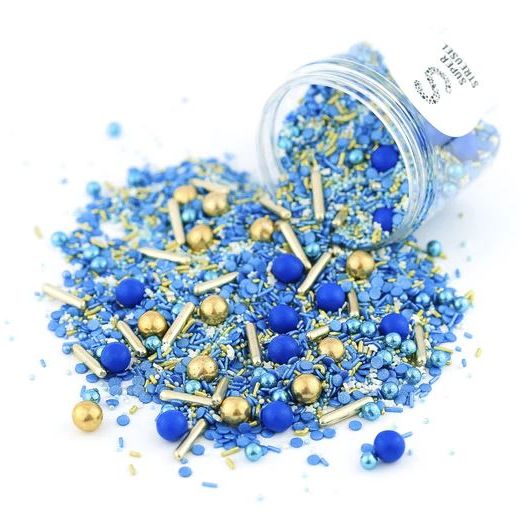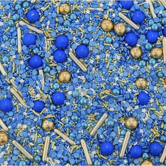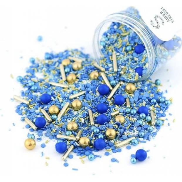 Kuchen, Muffins, Kekse, Brezeln oder einige typisch britische Kekse können mit dieser blauen Dekoration versehen werden. Tiefblaue und goldene Schokoladenkugeln, glitzernde metallische Knusperperperlen, Konfettistreusel, weiße Zuckersterne und goldene Zuckerstreusel. Rühren. Seien Sie also nicht traurig, wenn Sie die Dose zum ersten Mal in der Hand halten und zu viele kleine Streusel sehen. Um die ganze Pracht der Super Streusel zu sehen, kippen Sie die Dose einfach in eine größere Schüssel und lassen Sie sich überraschen. Achtung: Die länglichen Metalldragées enthalten dünne, rohe, mit Zucker überzogene Nudeln. Sie sind zwar die schönsten, aber auch die schwersten unserer Mischungen.