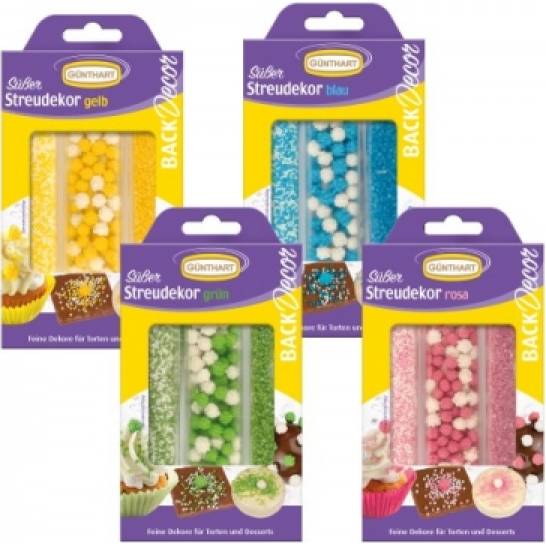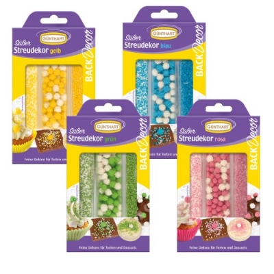 Zuckerstreusel in verschiedenen Farbvariationen. Mit diesen Zuckersternen und -perlen ist das Verzieren eines Kuchens oder einer Tasse ganz einfach. Die Kinder lieben es, ihren Pfannkuchen mit Schlagsahne zu verzieren. Zutaten: Zucker, Maisstärke, Glukosesirup, Aromen, Bienenwachsüberzug, Farbstoff: E 131. || Zutaten: Zucker, Maisstärke, Glukosesirup, Aroma, Bienenwachsüberzug. || Zutaten: Zucker, Reis, Glukosesirup, Farbe: E 131. Zutaten: Zucker, Reis, Glukosesirup, Farbe: E 171. Zutaten: Zucker, Farbe: E 131, E 171. || Zutaten: Zucker, Maisstärke, Glukosesirup, Aroma, Bienenwachsüberzug, Farbstoff: E 100, E 131.