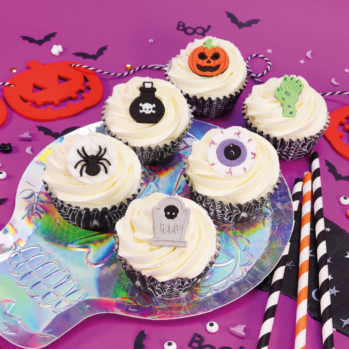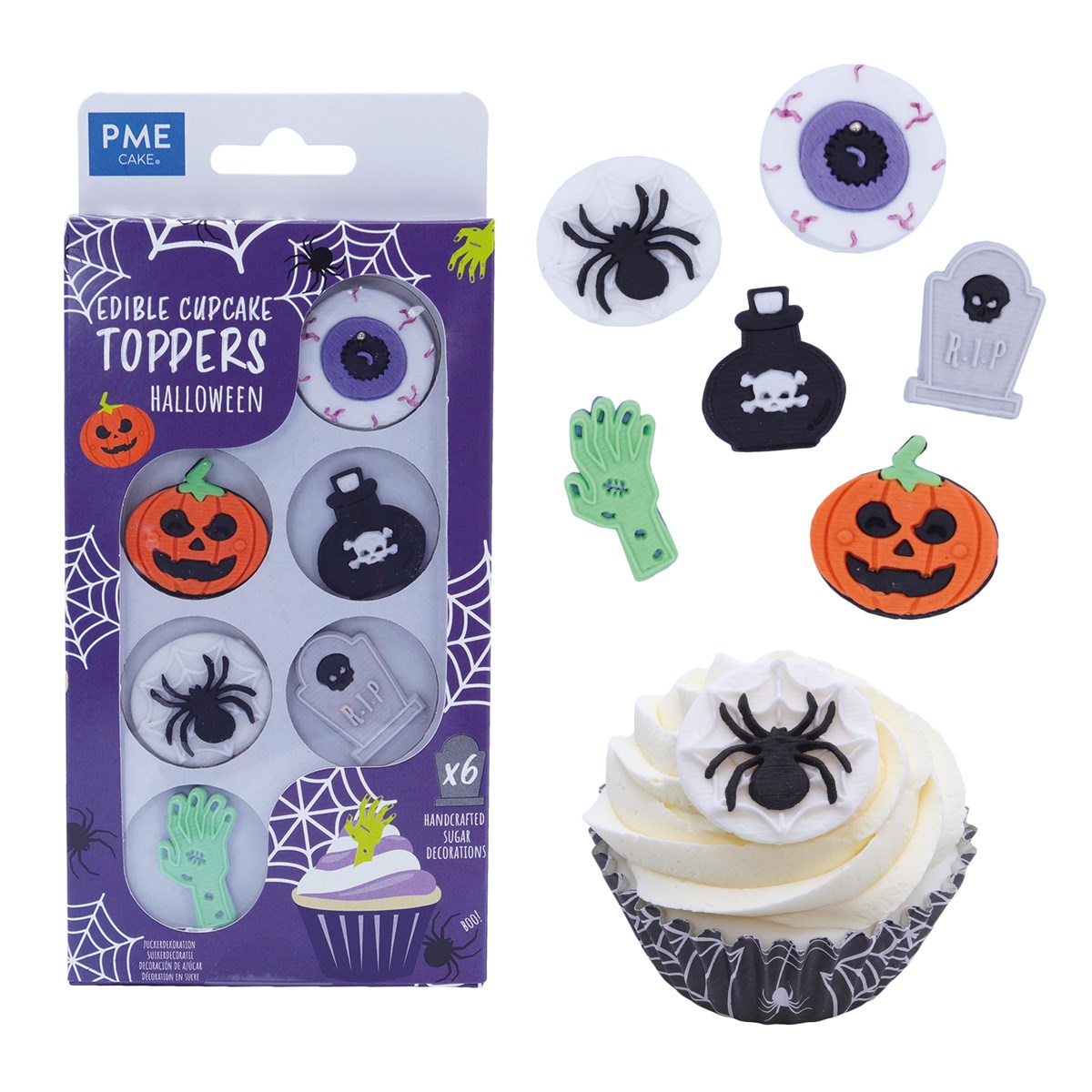 Essbare Zuckerdekorationen zum Thema Halloween. Verleihen Sie Cupcakes und Torten mit diesen Halloween-Zuckerdekorationen das Aussehen eines Grabsteins. Die einzelnen Produkte sind vorgestanzt. Legen Sie sie über frischen Zuckerguss oder Buttercreme, um schnell und effektiv zu dekorieren. Vollständig essbare, handgefertigte Dekoration aus Gummimasse. Jede Packung enthält eine Zombiehand, einen Augapfel, einen Kürbis, ein Spinnennetz und einen Grabstein. Größe jeweils ca. 5 cm, perfekt für Ihre Cupcakes, Feenkuchen, Muffins, Brötchen und Kekse.