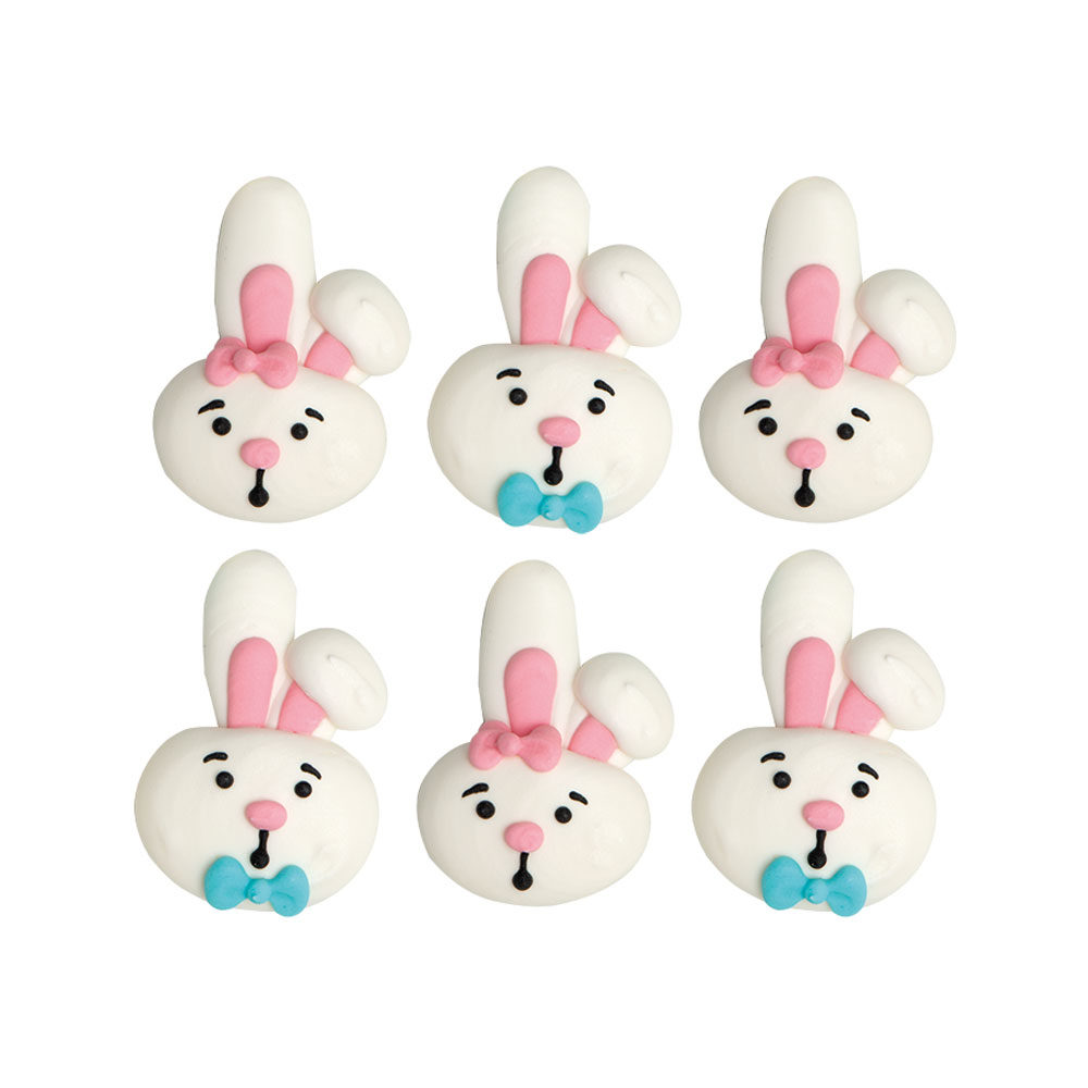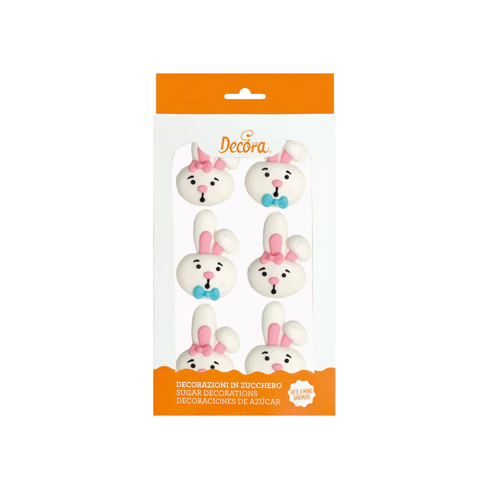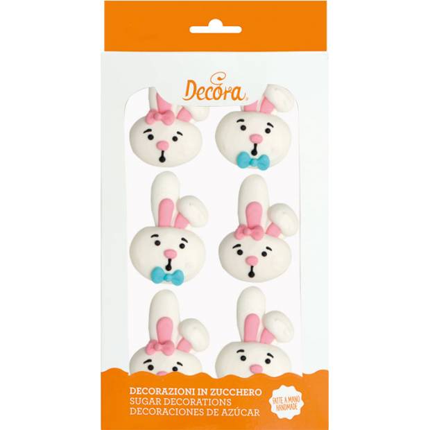 Zuckerhasen-Kuchendekorationen fertig zum Gebrauch. Die Dekorationen sind handgefertigt mit natürlichen Extraktionsfarbstoffen. Ideal für die Dekoration von Torten, Cupcakes und andere Desserts. Diese Dekorationen sind bereits fertig, keine Notwendigkeit für eine weitere Änderung. Abmessungen: 3,5 cm, 6 Stück pro Packung.