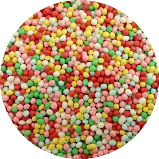 Zutaten: Zucker, Weizenmehl, Maismehl, Maisstärke, Reisstärke, Stabilisator Gummi arabicum, Maltodextrin, Carnaubawachs E903, Farbstoffe E120, E133, E171, natürlicher Färberdistel-Extrakt
