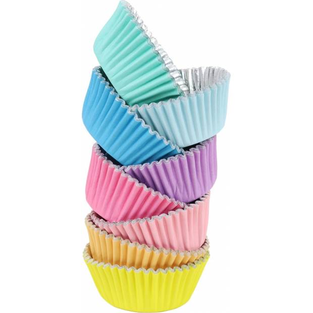 cupcake-förmchen aus farbigem Papier und mit Folie bedeckt, die Fettspuren verhindert. Wiederverwendbar. Für bessere Ergebnisse verwenden Sie eine Muffinform. Abmessungen der Förmchen: 50 x 70 x 28 mm. Packung 100 Stück, Farbmischung.