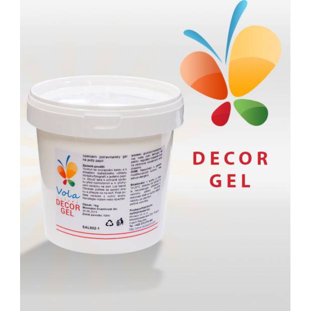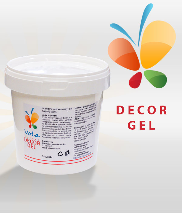 Decor Gel wird verwendet, um essbares Papier auf Tortenschalen zu kleben und um die Farben des Drucks auf essbarem Papier hervorzuheben. Das Gel wird in einer dünnen Schicht auf die Oberfläche der Torte aufgetragen, dann wird das essbare Papier aufgelegt und vorsichtig angedrückt. Um die Farben hervorzuheben, wird das Bild gleichmäßig mit einer dünnen Schicht Gel bestrichen. Die vorbereitete Torte mit der essbaren Papierdekoration wird für 3 Stunden in den Kühlschrank gestellt, damit das bedruckte Papier weich wird.