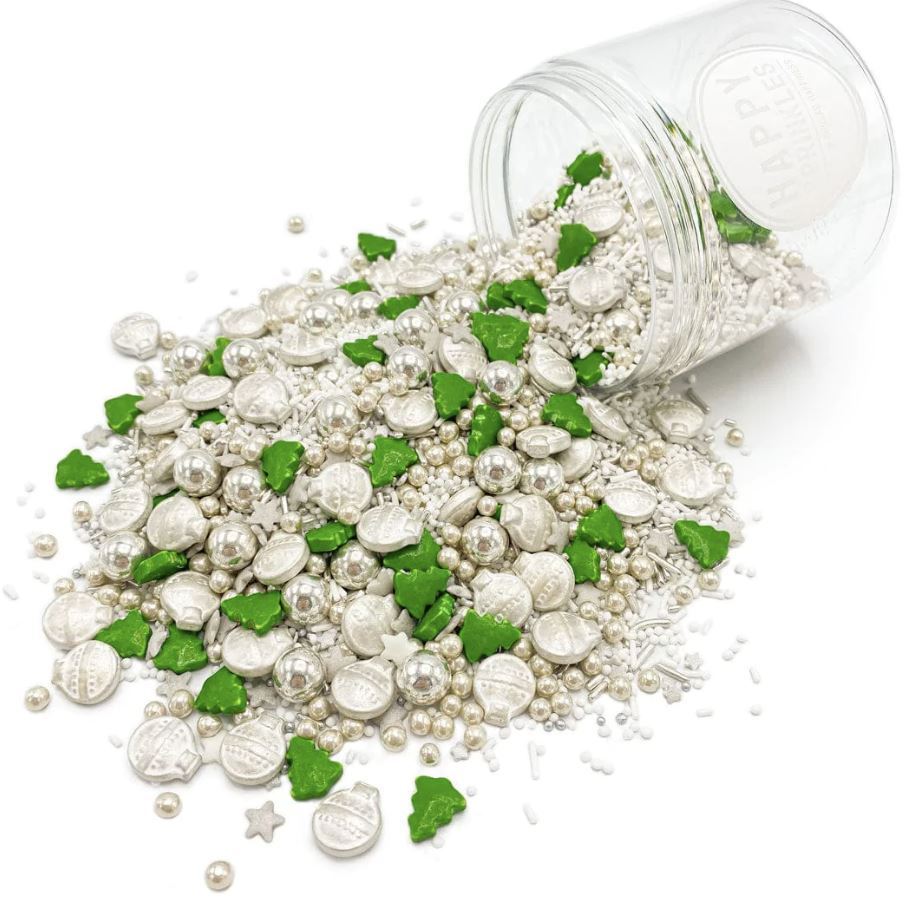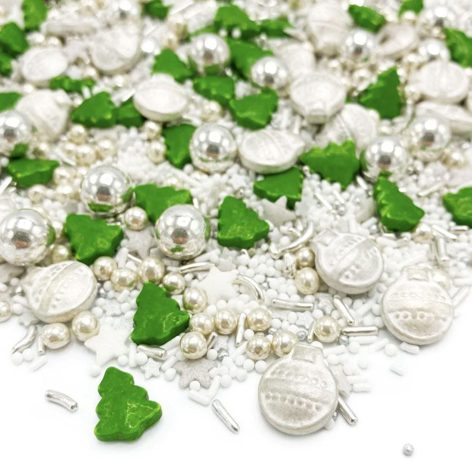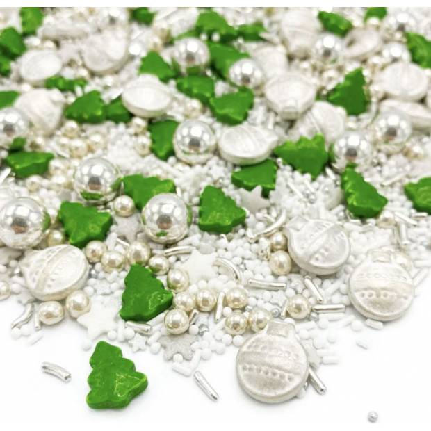 Mit Sprinkles Christmas Eve 90g können Sie jedes Backwerk in eine schöne Weihnachts-Szene verwandeln. Die Streudekoration enthält verschiedene Figuren, wie Weihnachtskugeln, Stränge, Sterne und Weihnachtsbäumchen in den Farben Silber, Grün und Weiß. Dank der hübschen Mischung verschiedener Figuren können Sie mit Sprinkles Christmas Eve Torten, Cupcakes, Kuchen, Gebäck und andere Köstlichkeiten perfekt dekorieren. Diese Mischung können Sie auch in Kombination mit unseren weiteren essbaren Streu-Produkt verwenden. Zum Beispiel verwenden Sie Nonpareilles, Zuckerperlen oder bunten Zucker, um eine festliche Szene zu schaffen.