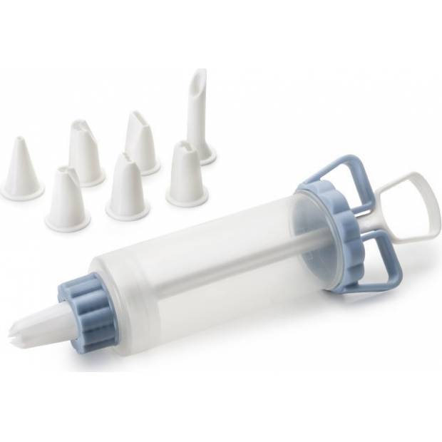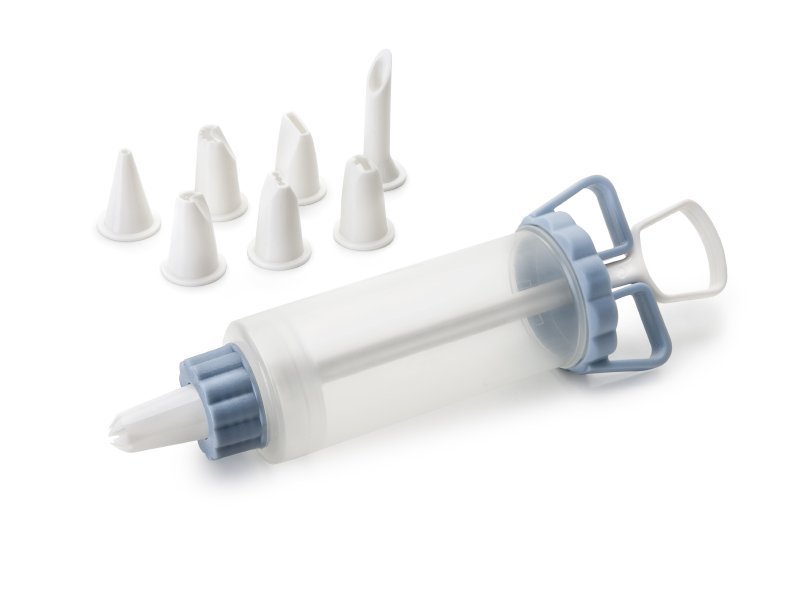 Die Verzierungspistole ist aus Kunststoff gefertigt und mit einer Spitze versehen, mit der Sie Krümel oder Glasur stets mühelos und präzise ausdrücken können. Die einzelnen Verzierungsspitzen werden auf die Pistole aufgeschraubt, sodass Sie sie während des Dekorierens wechseln können. Die Länge der Pistole beträgt 18 cm.