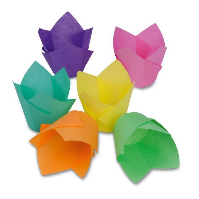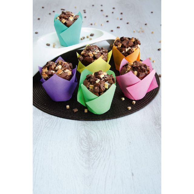 "Papier-MTulpenförmchen in verschiedenen Farben zum Backen. Papieren Förmchen eignen sich zum Backen von Muffins und Cupcakes. Füllen Sie die Förmchen beim Backen immer nur zu 2/3, der Teig vergrößert beim Backen sein Volumen.