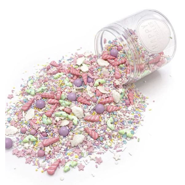 Dieser zerbrechliche Mix „Aber zuerst, Einhörner“ lässt das Herz aller Einhornfans schneller schlagen. Rosafarbene Einhornhörner, grüne Regenbögen, weiße Wolken und violette Schokoladenperlen sind eindeutig die Stars dieser Streu-Mischung. Eindrucksvoller ist jedoch auch die Basis aus pastellfarbenem Zuckerstreusel und weiß-punkten Sternchen.