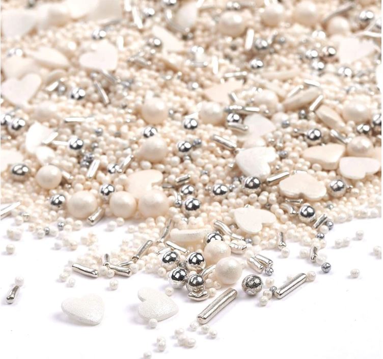 Hört das Glockenklang der Hochzeitsglocken – gekleidet in Weiß mit einem Blumenstrauß, die den Gang hinuntergehen möchten… Und sie sollen glücklich bis ans Ende ihrer Tage leben. Diese Verzierungsmischung ist perfekt für jede elegante Dekoration der Hochzeitstorte. Allerdings müsst ihr euch nicht wirklich trauen, nur um sie zu verwenden, um euren Backkreationen Funken zu verleihen. Ob Kuchen, Gebäck oder Plätzchen – oder vielleicht habt ihr eine andere Idee, wie ihr diese schönen Streuer verwenden könnt? Die Möglichkeiten sind endlos. Mit weißen und silbernen Zuckerperlen, Herzchen und Schokoladenbruch – eure Kreativität kennt keine Grenzen.