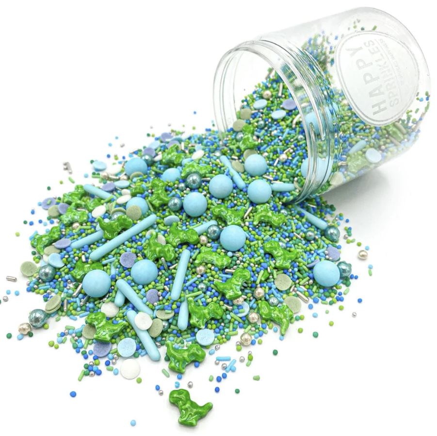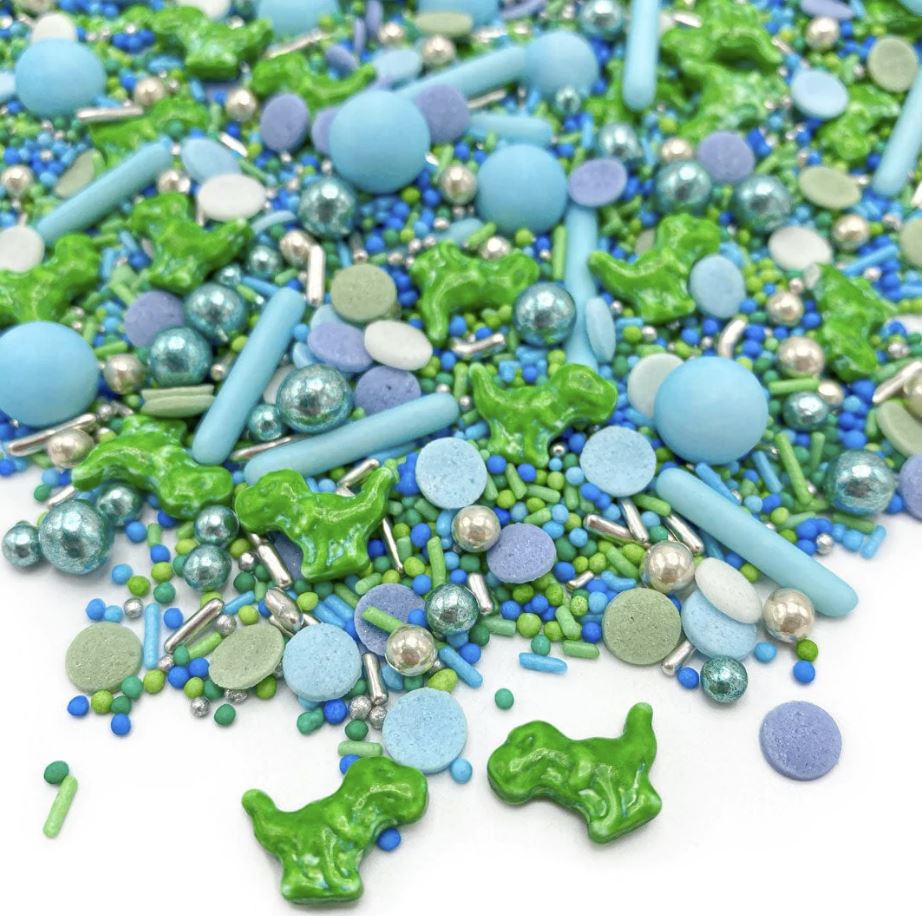 Wer als Kind nicht eigene Dinosaurier haben wollte. Mit dieser Streu-Kombination kannst du sie wieder zum Leben erwecken. Neben den kleinen Dinosauriern T-Rex findest du hier blaue, grüne und silberne Schokoladen-Perlen, blaue Stäbchen und blaugrüne Konfetti. Die Basis bilden grüne und blaue Zuckerperlen und silberne Fäden. Wenn du Aufmerksamkeit erregen willst, sind Jurassic Party Sprinkles genau das Richtige. Dank ihres ungewöhnlichen Motivs sind die Streusel ein echter Blickfang.
