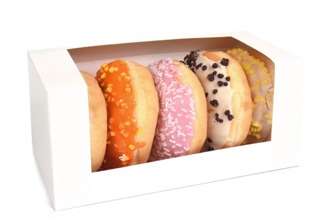Eine einfarbige Donut-Verpackung in weißer Ausführung. Darin passen 5 Stück Donuts hinein. Die Abmessungen der Verpackung betragen 185x95x90mm.