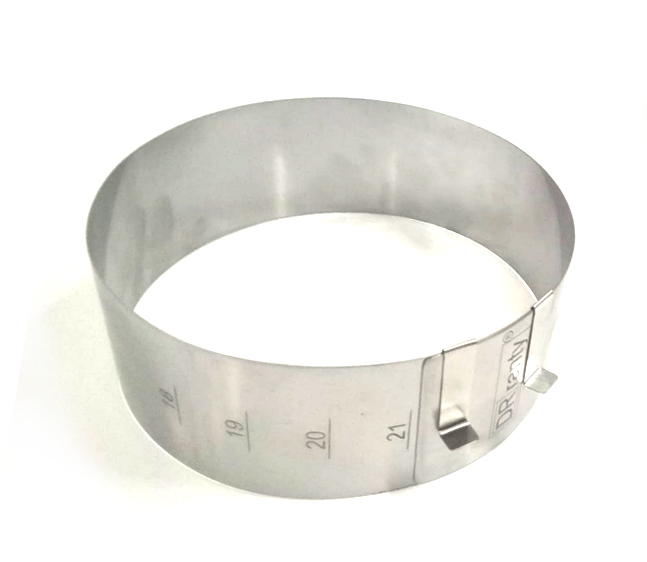 Rundes einstellbare Form für Kuchen. Einstellbarer Rand der Form mit Durchmesser 18 - 21 cm. Er hat eine praktische Skala (jeder 1 cm), dank der Sie den gewünschten Teigdurchmesser genau einstellen können. Die Form ist 8 cm hoch. Hergestellt aus widerstandsfähigem und formstabilem Edelstahl mit Zertifikat. Das Set enthält zwei Montagespangen. Die Konditorenrundeform ist eine Alternative zu traditionellen Backformen. Sie ist jedoch viel funktionaler, weil sie beliebig angepasst werden kann. Die Verwendung eines Rings erleichtert unter anderem das Fehlen eines Bodens und zwei mit dem Set befestigten Spannbacken, die zum Befestigen der Seiten dienen. Es reicht aus, Backpapier oder Pergament auf eine Oberfläche zu legen, den einstellbaren Rand darauf zu stellen und dann die Masse hinein zu geben. Nach dem Herausnehmen aus dem Ofen behält das Gebäck seine perfekte Form. Außerdem ist es einfacher, es in Stücke zu schneiden als Süßigkeiten auf dem klassischen Backblech. Hergestellt aus widerstandsfähigem und formstabilem Edelstahl mit Zertifikat. Das Set enthält zwei Montagespangen. Die Konditorenrundeform ist eine Alternative zu traditionellen Backformen. Sie ist jedoch viel funktionaler, weil sie beliebig angepasst werden kann. Die Verwendung eines Rings erleichtert unter anderem das Fehlen eines Bodens und zwei mit dem Set befestigten Spannbacken, die zum Befestigen der Seiten dienen. Es reicht aus, Backpapier oder Pergament auf eine Oberfläche zu legen, den einstellbaren Rand darauf zu stellen und dann die Masse hinein zu geben. Nach dem Herausnehmen aus dem Ofen behält das Gebäck seine perfekte Form. Außerdem ist es einfacher, es in Stücke zu schneiden als Süßigkeiten auf dem klassischen Backblech.
