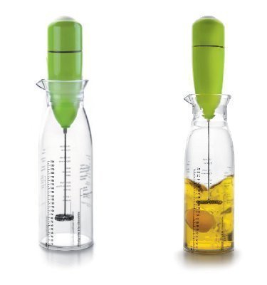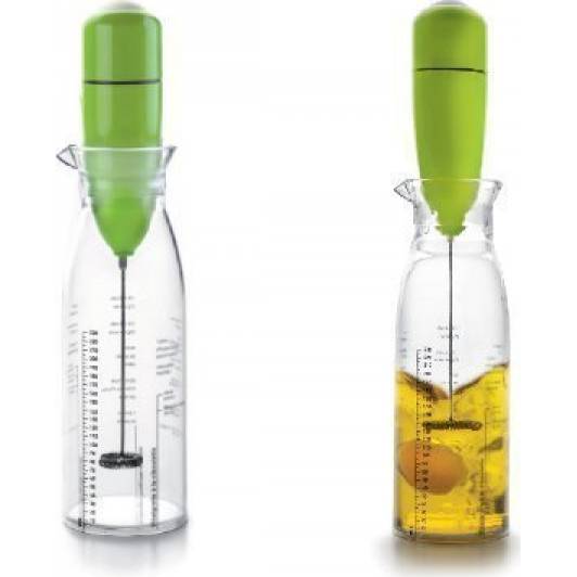 Er ist sehr einfach zu bedienen - füllen Sie den Behälter mit Öl, Essig, Kräutern, Gewürzen und anderen Zutaten, stellen Sie den Mixer darauf und drücken Sie die Starttaste... Der 2,5-Deciliter-Mixbehälter ist aus hochwertigem, transparentem Kunststoff gefertigt, der Mixer funktioniert mit zwei AA-Batterien.