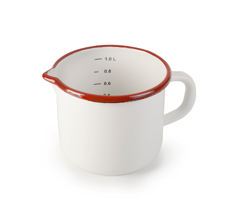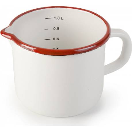 Messbecher aus Metall mit hochwertiger emaillierter Oberfläche. Er hat eine weiße Farbe mit rotem Rand. Die Skala befindet sich auf der Innenseite des Messbechers (max. 1 l). Spülmaschinenfest.