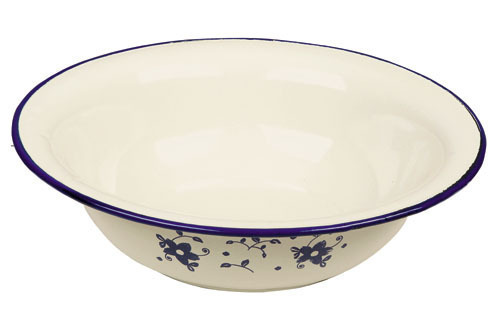 Eine Schale klassischer Form aus hochwertiger weißer Emaille mit zartem blauen Blumenmuster hat ein Fassungsvermögen von 5 Litern und vielseitige Einsatzmöglichkeiten.