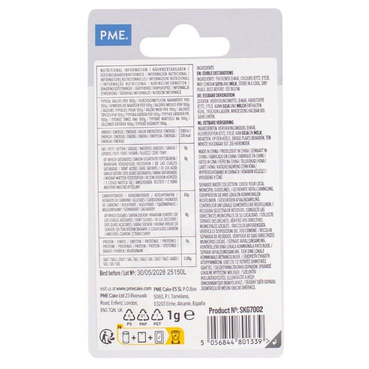 Diese essbaren funkelnden Sternchen von PME sind das kleine Detail, das einen riesigen Unterschied macht. Sie glänzen schön, kleben perfekt auf Sahnecreme und Glasur und verwandeln jeden Kuchen sofort in eine feierliche Torte, die eine Sternenfeier verdient. Eine Prise genügt, und deine Cupcakes, Donuts, Eis, Lebkuchen oder Kuchen erhalten einen luxuriösen silbernen Effekt.