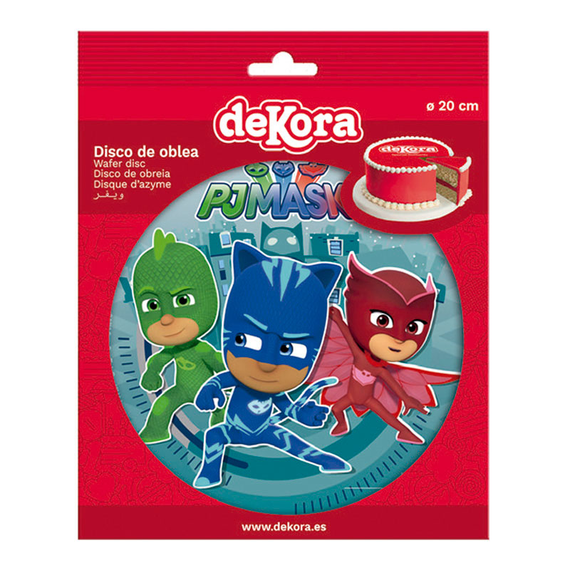 essbares Papier für eine einfache und schnelle Dekoration von Kuchen. Es handelt sich um ein glutenfreies Produkt. Für seine Herstellung werden hochwertige Rohstoffe und Lebensmittelfarben verwendet. Der Druck erfolgt in einem speziellen lebensmittelfähigen Drucker. Das essbare Papier ermöglicht die Dekoration von Kuchen oder anderen Desserts. Es wird auf einen fertigen Kuchen gelegt, dessen Oberteil Sie mit einer dünnen Schicht Buttercreme oder einem fixierenden essbaren Gel bestreichen können. Legen Sie dieses Blatt auf diese Schicht, glätten Sie es und bestreichen Sie es erneut mit dem Gel. Es hält besser und seine Farben verleihen Glanz. Bringen Sie es mindestens drei Stunden vor dem Verzehr auf den Kuchen auf, damit er beim Servieren weich ist. Dieses essbare Papier ist mit dem Motiv des Märchenhelden PJ Masks bedruckt. Durchmesser 20 cm.